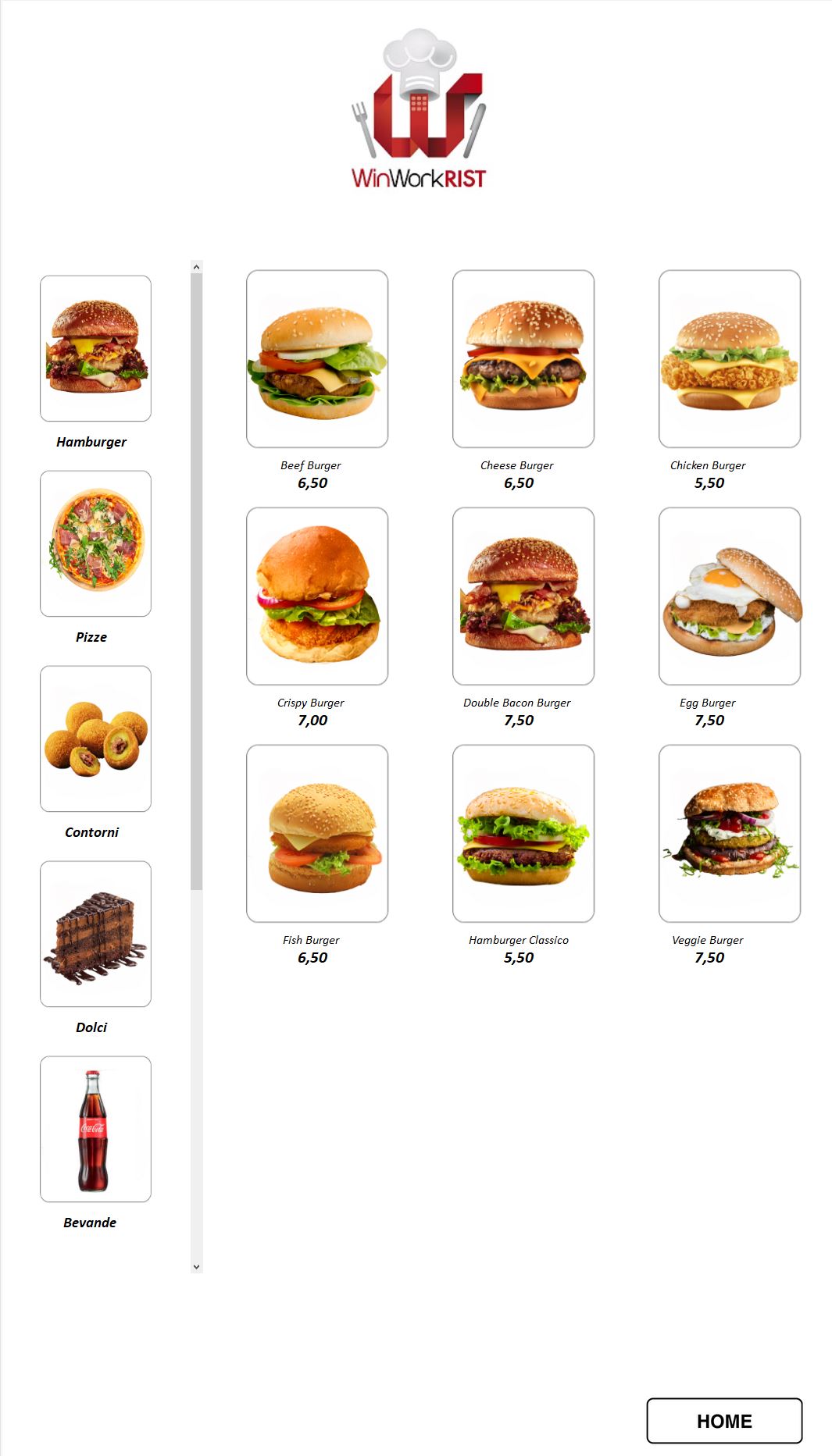 Sullo schermo vengono mostrate tutte le categorie di pietanze disponibili. Selezionando una categoria, l’utente può scegliere le pietanze. E’ possibile modificare gli ingredienti (aggiunta o rimozione), con il calcolo automatico di eventuali sovrapprezzi.